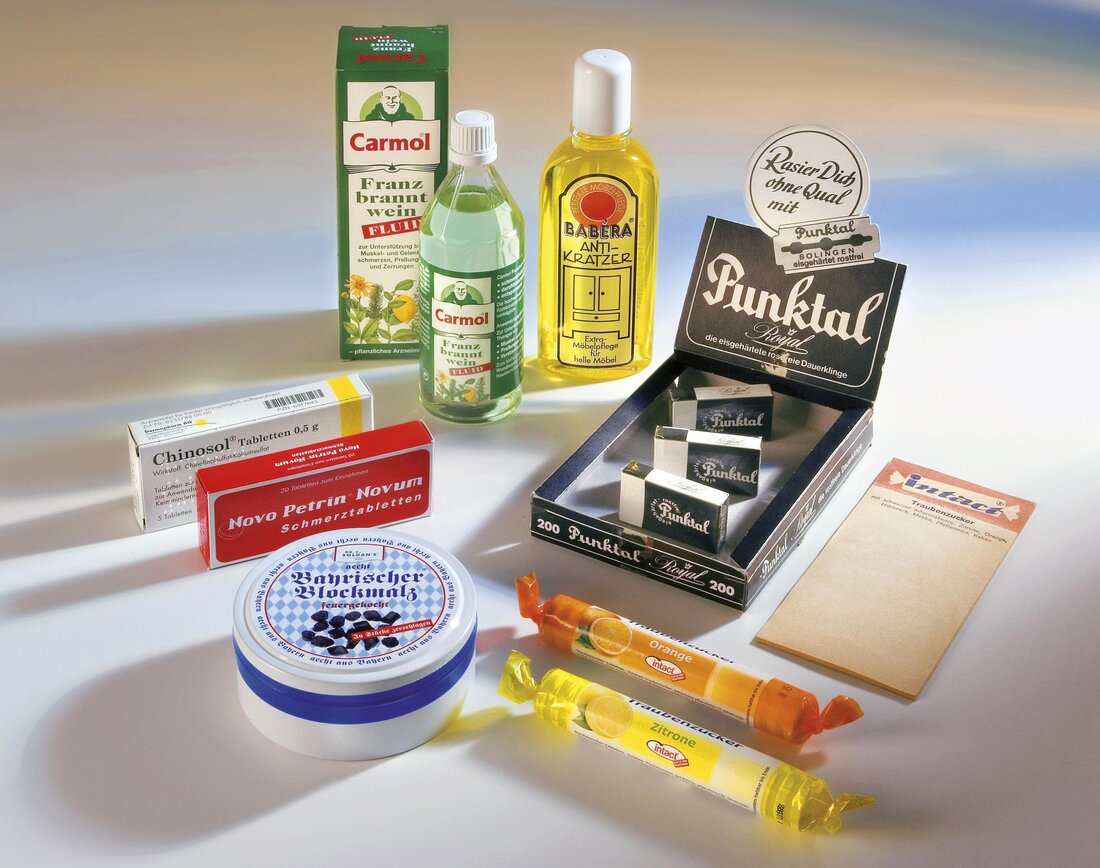 The product line included disinfectants for working animals, melissa spirits, analgesic tablets, razor blades and also intact grape sugar, which can still be found in pharmacies today.
