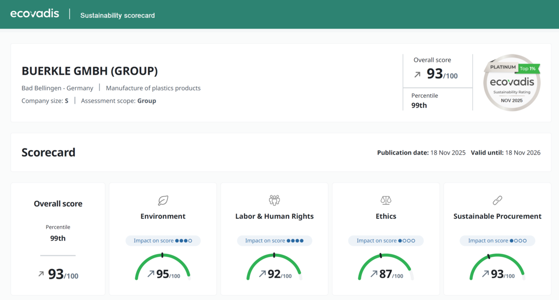 EcoVadis is an international platform for sustainability ratings and intelligence, supporting more than 100,000 companies in improving their sustainability performance and optimizing their value chains. In addition, EcoVadis helps manage ESG (Environmental, Social & Governance) risks and compliance (a business and legal term for adherence to rules by companies), as well as evaluate sustainability practices within the supply chain. Bürkle was already assessed by EcoVadis in 2023, and we are pleased to share our results with you again this year.