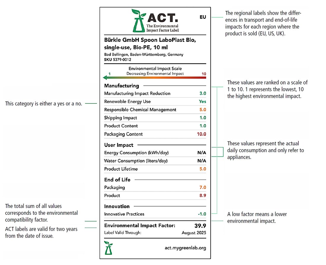 The fact that Bürkle Bio-PE samplers are disposable products contradicts the desired longevity and sustainability associated with Bürkle’s high-quality products. Sterile items, for instance, have a limited shelf life of two years from their manufacturing date. In line with the transparency principle of the ACT label, this limitation is evident in the rating and is unavoidable in this product category.