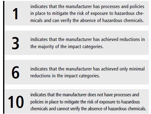 Scores on the ACT Label range from 1, indicating the lowest environmental impact, to 10, indicating the highest environmental impact. For equipment, the values for energy and water consumption represent the actual daily consumption and may exceed a value of 10.