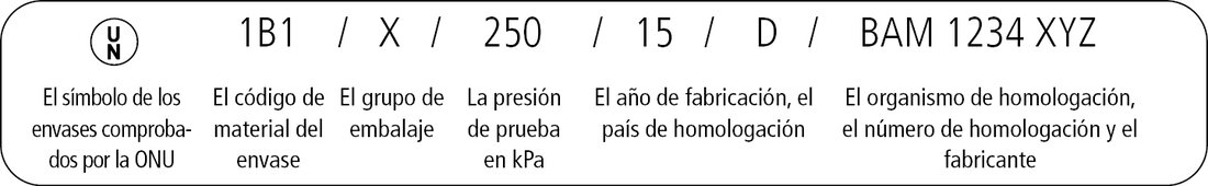 La identificación contiene el símbolo de los envases comprobados por la ONU, el código de material del envase, el grupo de embalaje, la presión de prueba en kPa, el año de fabricación, el país de homologación, el organismo de homologación, el número de homologación y el fabricante.