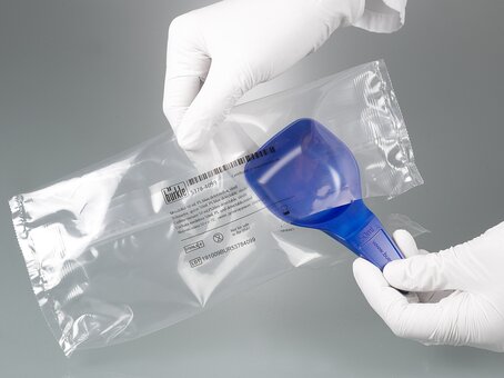 検出可能な青いポリスチレン製の使い捨て粉末漏斗は、クリーンルーム・クラス7(10,000)で製造され、使い捨て用に個包装された後、滅菌される。