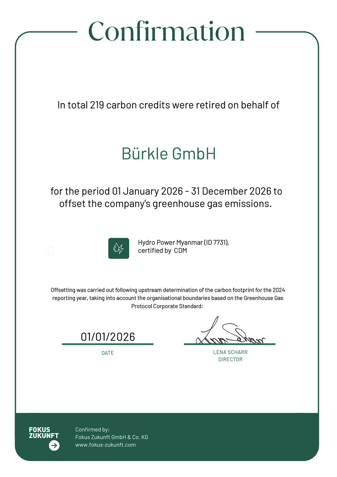 Dzięki zrównoważonemu wykorzystaniu zasobów, ograniczeniu emisji i wspieraniu projektów klimatycznych, otrzymaliśmy certyfikat Climate Neutral Company od Fokus Zukunft. Oznacza to, że działamy w sposób zrównoważony i całkowicie kompensujemy emisję CO2które emitujemy poprzez naszą pracę w Bürkle. Certyfikacja jako firma neutralna dla klimatu jest dla nas decydującym krokiem w kierunku zapewnienia zrównoważonego działania i ochrony naszego środowiska.