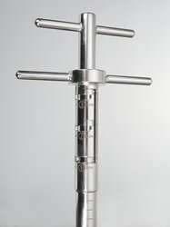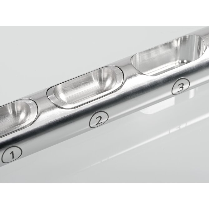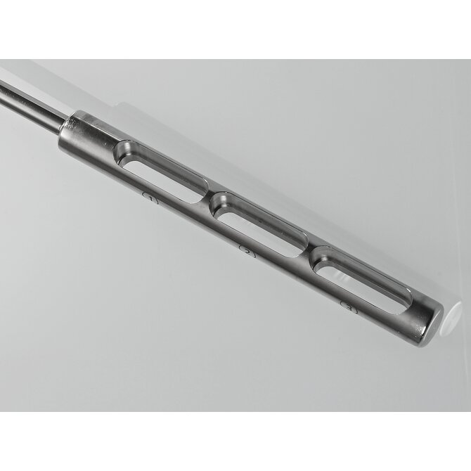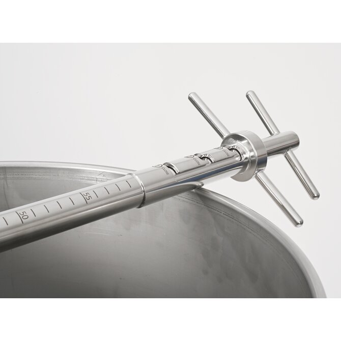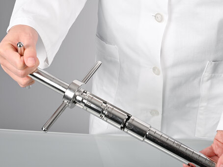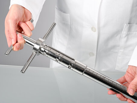 Głębokość zanurzenia lancy do próbek jest łatwa do odczytania dzięki laserowo wygrawerowanej skali głębokości. Zaokrąglona końcówka zapobiega zarysowaniu pojemnika. Dwa dodatkowe uchwyty zapewniają bezpieczne wkładanie, mocowanie i obracanie materiału. Precyzyjnie dopasowane wkładki zapobiegają mieszaniu się materiału i umożliwiają łatwy demontaż w celu dokładnego czyszczenia.