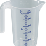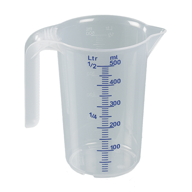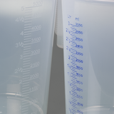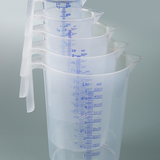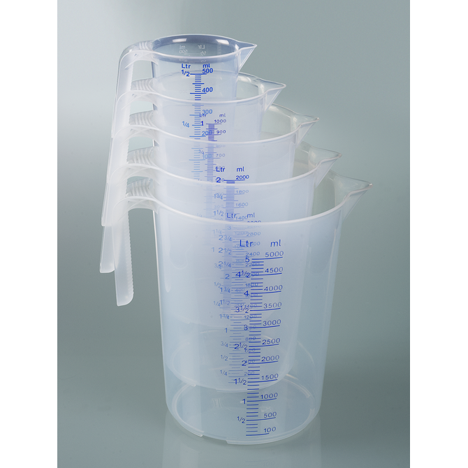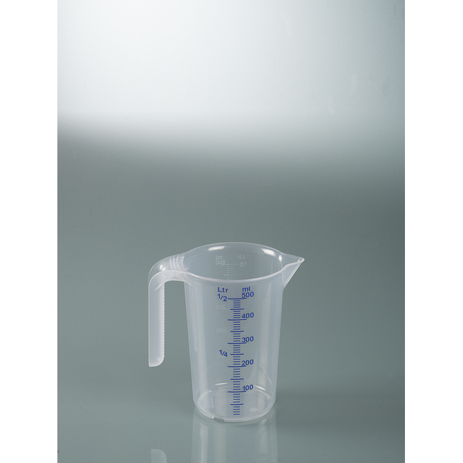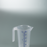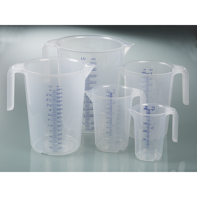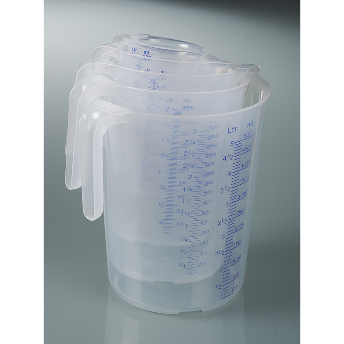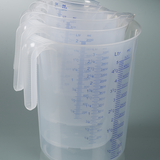 A jarra de medição tem duas escalas de medição, transparentes em relevo e com letras azuis. Com alça ergonômica, disponível em design fechado para estabilidade especial ou com alça aberta para empilhamento e economia de espaço.